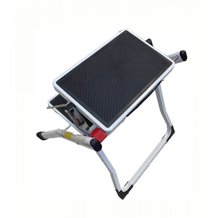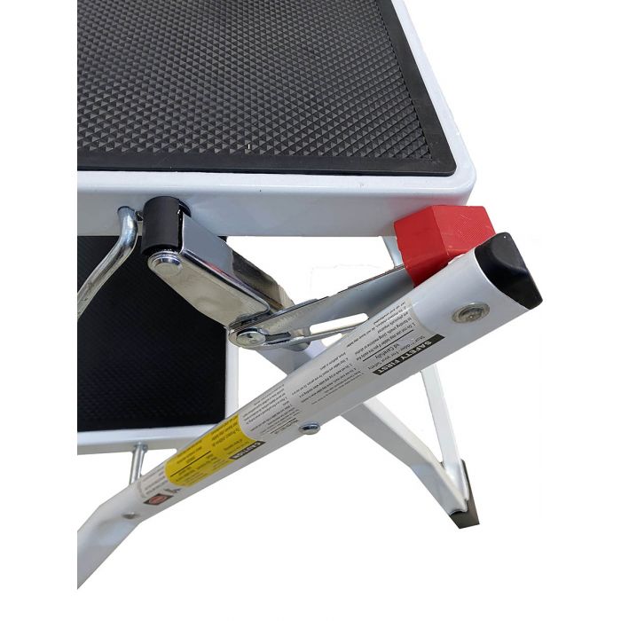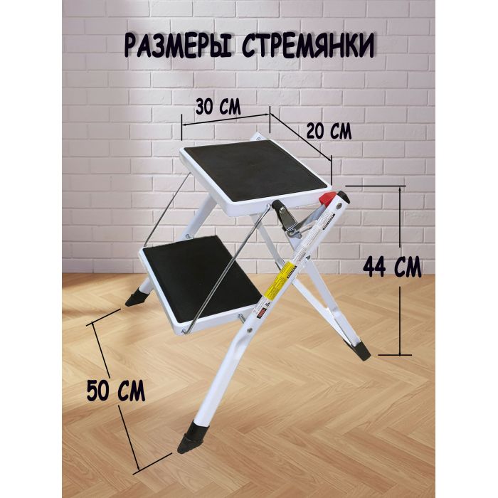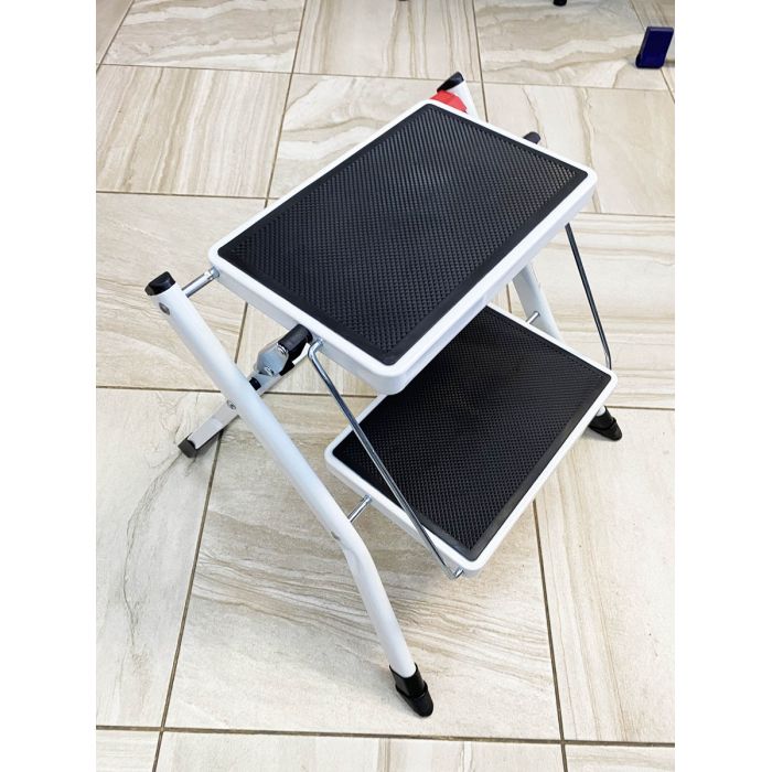 Практичная стремянка-табурет с простым механизмом раскладывания. Нажмите на клавишу — и вы на нужной высоте.