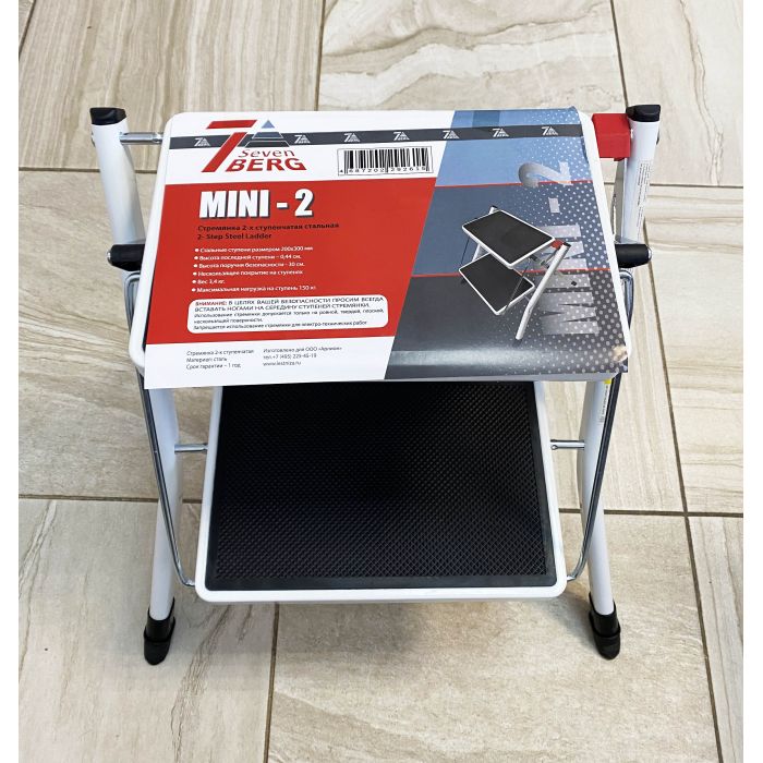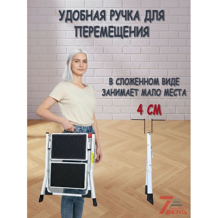 Безопасность превыше всего: Двухкомпонентные заглушки на ножках защищают полы от царапин и предотвращают скольжение. Стальная стремянка с широкими ступенями SevenBerg Mini — это ваш универсальный помощник, который делает любую работу на высоте простой и безопасной.