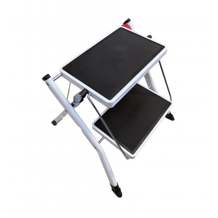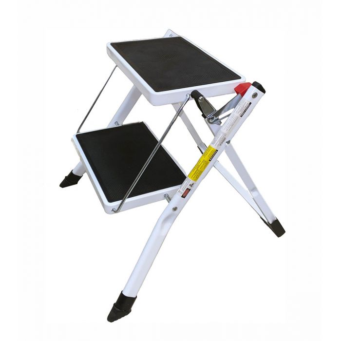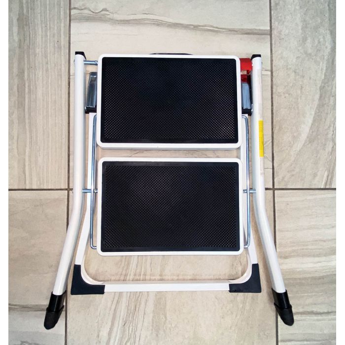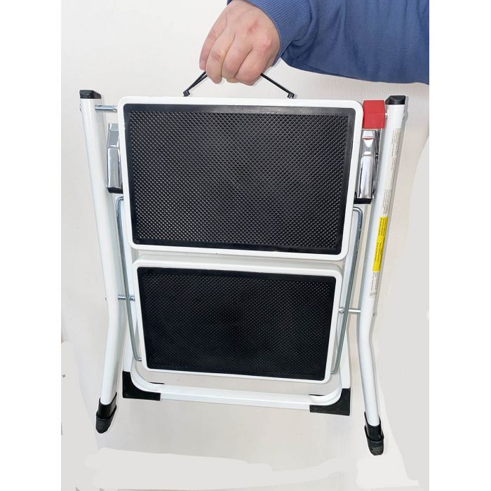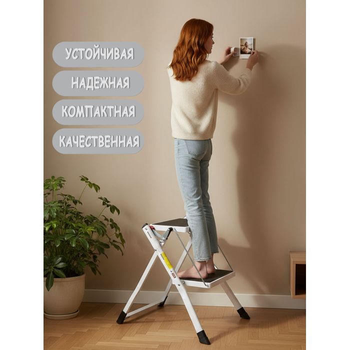 Прочная стальная стремянка, которая в сложенном виде занимает всего 4 см в толщину. Легко хранится за дверью или в шкафу.
