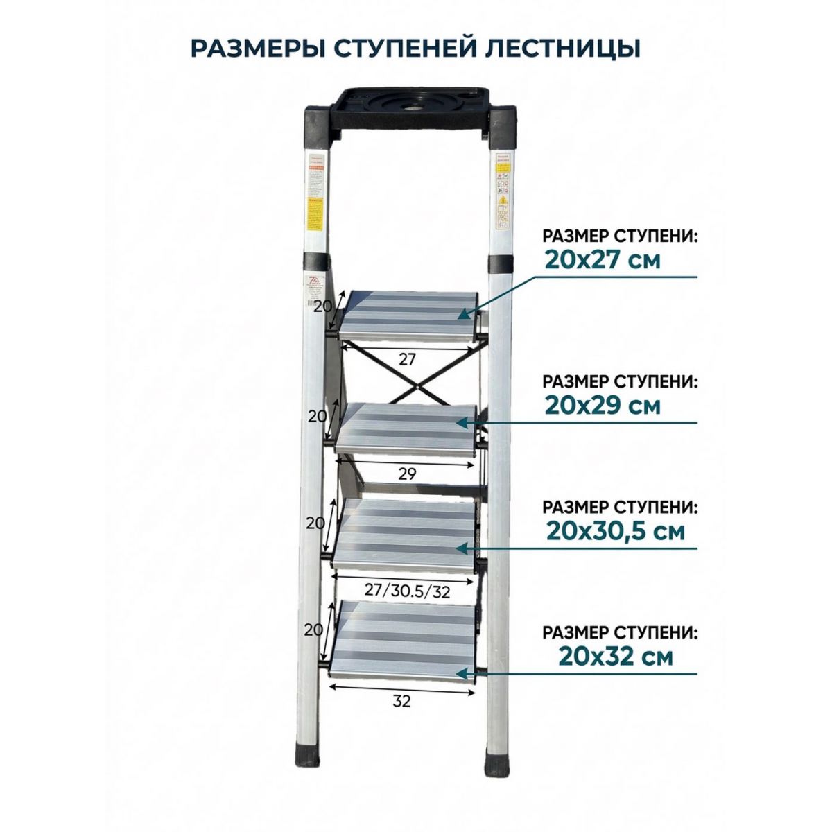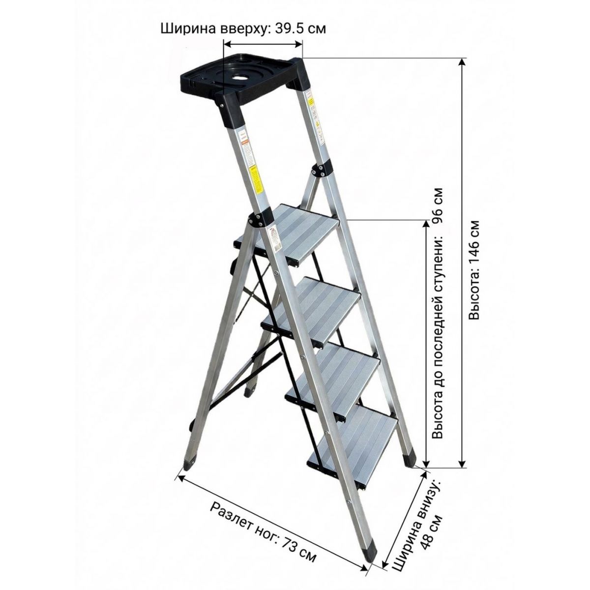 • Высокая нагрузка: Каждая ступень выдерживает до 150 кг, поэтому стремянка подходит для пользователей любой комплекции.