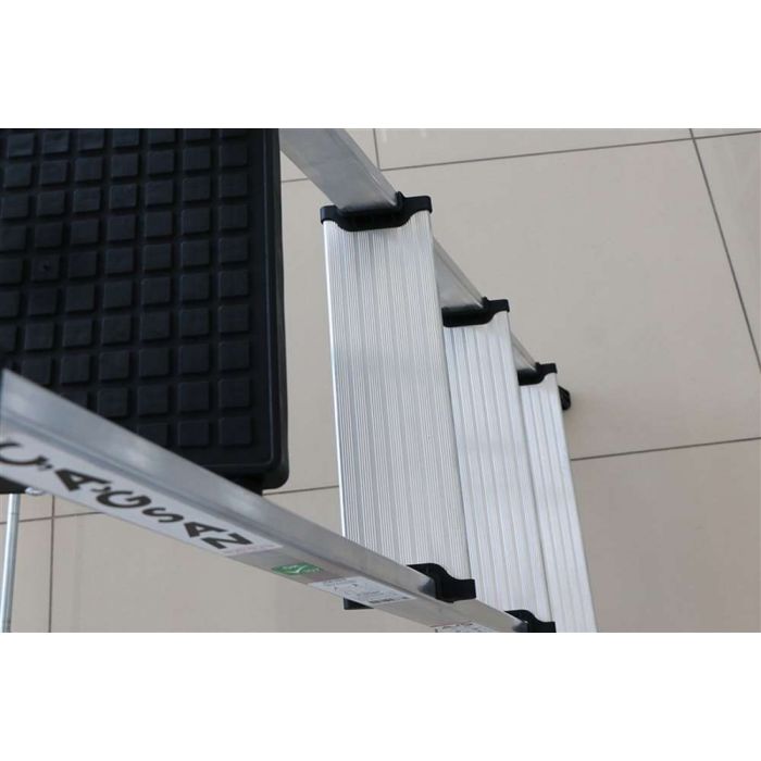 Особенность Профессиональных алюминиевых стремянок Хазар - увеличенный шаг ступеней – 28 см. Другими словами, высота площадки 5-ти ступенчатой стремянки Хазар соответствует высоте обычной 6-ти ступенчатой стремянки. Ширина стремянки также на 10-15% больше чем у одноклассников.