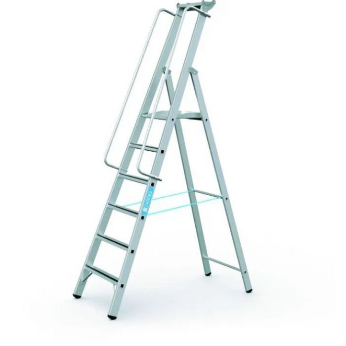 Устойчивое положение на платформе обеспечивается большой площадкой и противоскользящими ступенями по технологии Safer Step. Согласно требованиям отраслевого страхового союза: «Легкая лестница с платформой».
